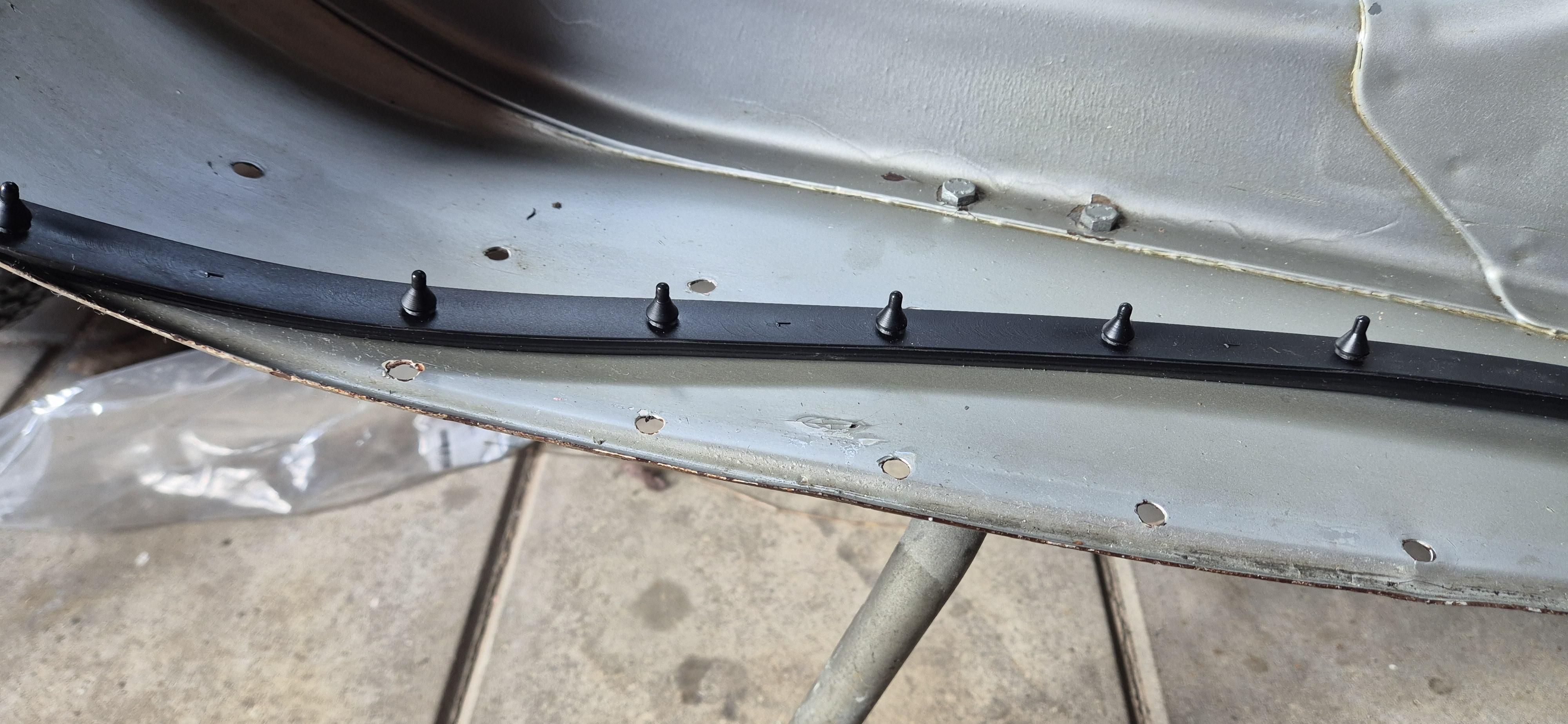Ik heb ook een v50 R uit 1976 en inderdaad deze rubberen strips horen hier op. Water koken en iets af laten koelen, rubbers laten baden (eventueel herhalen) tot ze soepeler zijn. Dan zover mogelijk van bovenaf door het gaatje duwen en van onderaf voorzichtig met een tang aantrekken tot hij erin plopt. Het is een rot werkje maar met wat geduld goed te doen. Pas op dat je niet te hard trekt anders gaat het rubberen pieletje kapot. Als de Vespa is overgespoten kan het zijn dat de gaatjes kleiner zijn geworden in diameter, dan evt wat ruimer maken met een boortje in de accutol. Succes!